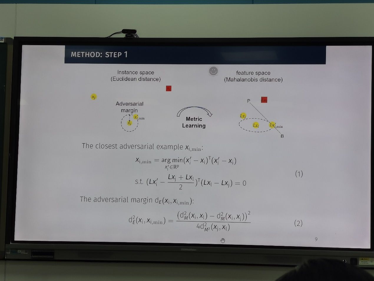 此次的报告内容围绕提高度量学习方法的稳健性和通用性展开。提出了度量学习的方法,该方法利用一个优化问题来学习距离度量,从而将看似相似的样本拉到一起,而将不同的样本推开。此次报告首先介绍了两种学习距离矩阵的算法,它们可以分别应用于连续数据和分类数据。一种是为了提高度量学习算法对对抗性示例的鲁棒性,第二种是利用对抗性训练,这是一种广泛使用的提高对抗性鲁棒性的策略,以减轻特征模糊。此外,杨笑尘老师还对深度度量学习的最新发展以及度量学习在可更新系统中的应用做了简要概述。讲座最后,王艳清教授和同学们积极与杨老师讨论,同学们对相关领域的知识了解得更为深入。