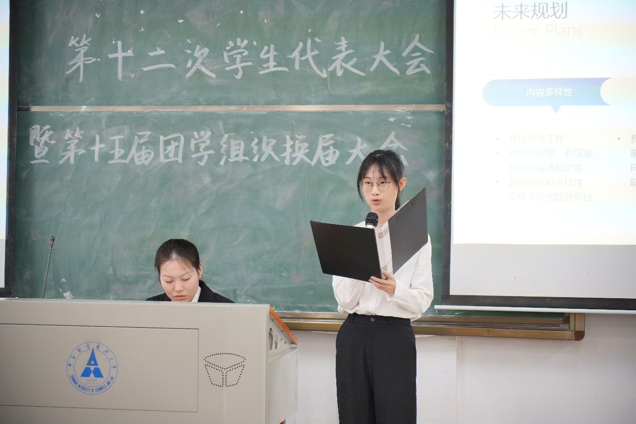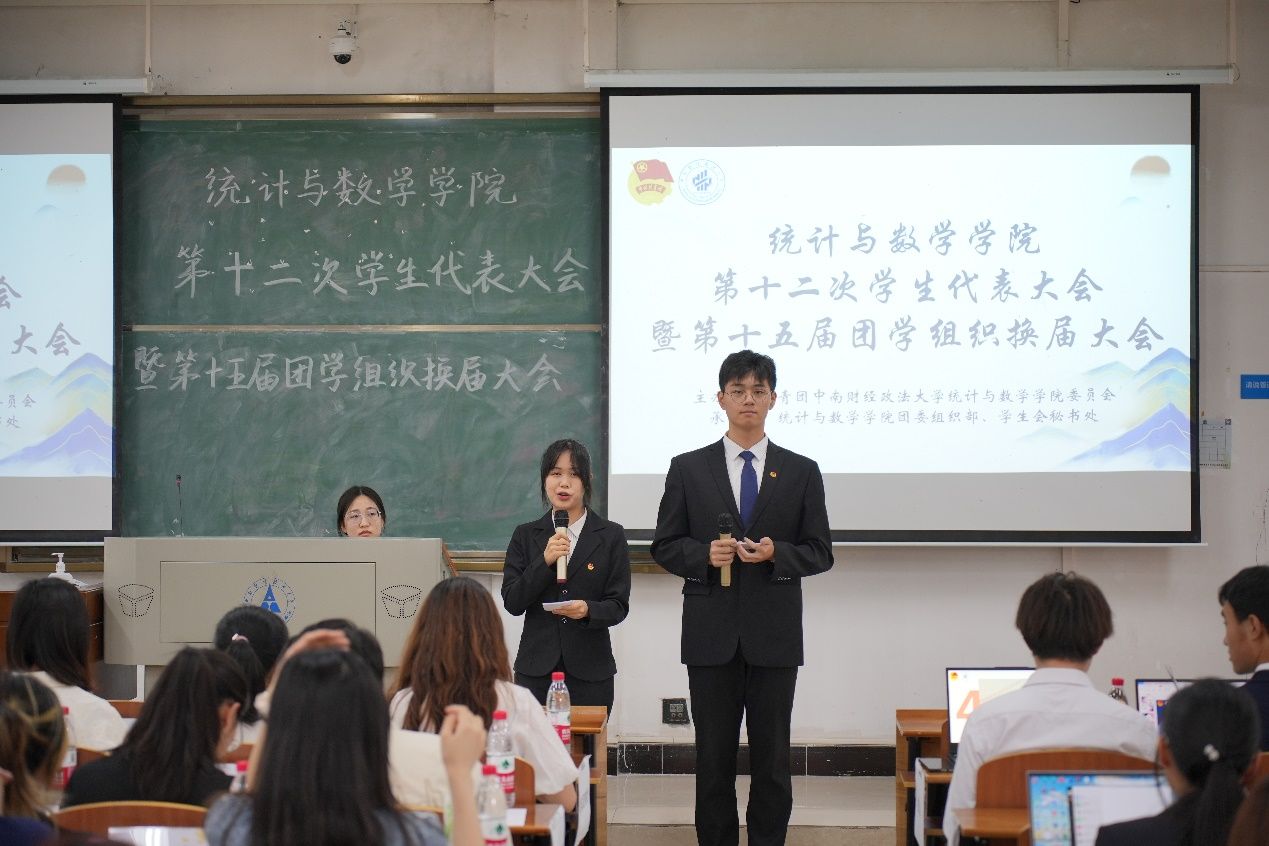 (通讯员:杜艺航 石千禾)5月14日下午,统计与数学学院第十二次学生代表大会暨第十五届团学组织换届大会在文澜110教室顺利召开。院党委副书记王瑄,学办主任、22级辅导员胡瑶,团委书记、19级辅导员陈盈,团委副书记、21级辅导员舒鑫才,22级辅导员伊帕尔古丽以及校学生会主席李乐怡出席本次活动。