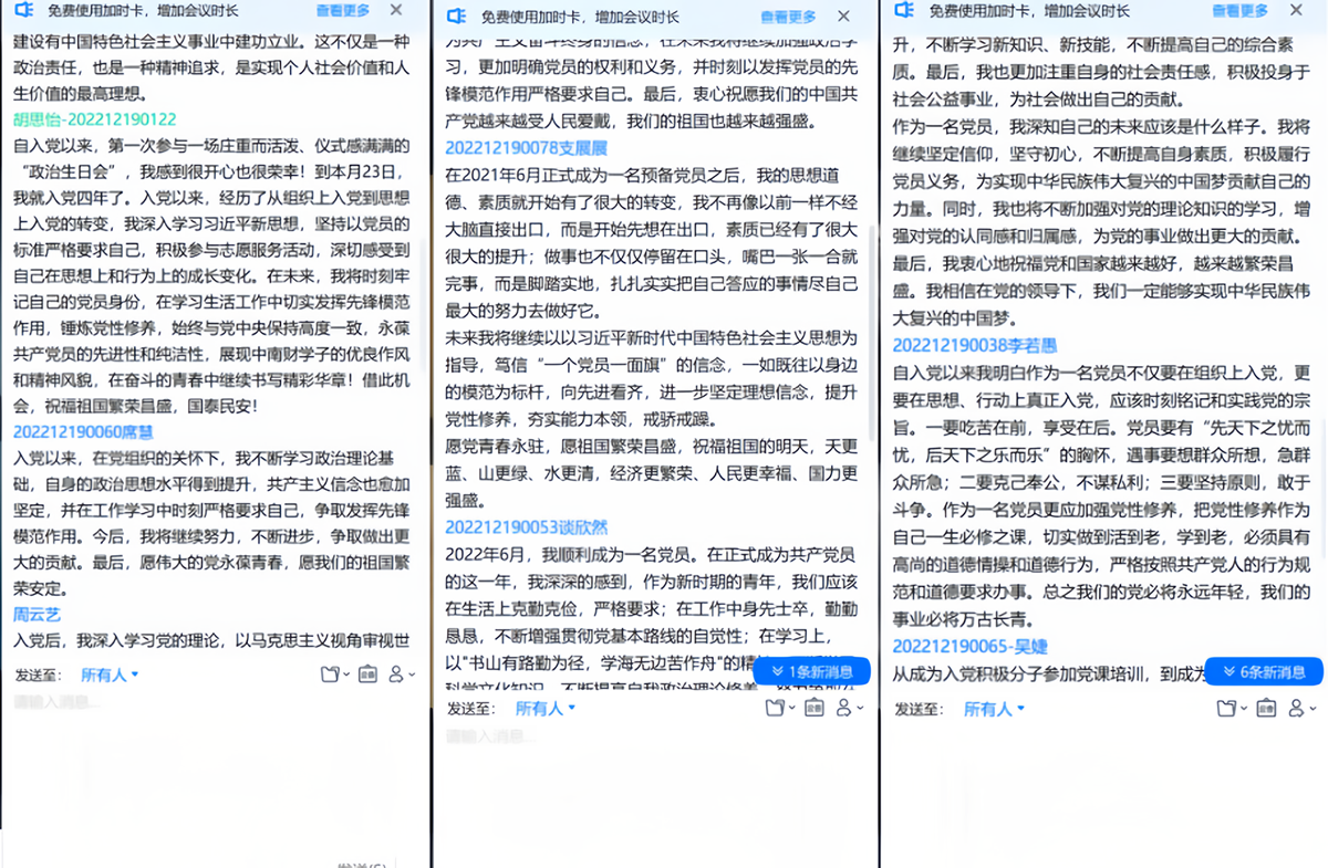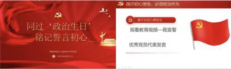 第二项活动主题为“同过‘政治生日’,铭记誓言初心”,由党支部组织委员袁睿洁同志主持,为六月入党的党员同志“庆生”。袁睿洁同志带领大家重温入党誓词,观看教育视频——《我宣誓》,在热烈的活动氛围中,六月过“政治生日”的党员纷纷在聊天框发表自己的感想,回顾入党以来自己在思想和行为上的转变,提出在未来生活和工作中对自己的期待和要求,也对党和国家献上了最衷心的祝福。