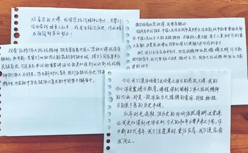 活动结束后,班级发起观影学习心得征集,收到多份书面感悟。有的同学感慨道:“我的内心深受震撼与教育。此思政课深刻阐释了伟大抗战精神的内涵,那是一段用血与火熔铸的爱国、团结、牺牲与自强不息的历史丰碑。”还有的同学写道:“作为新时代青年,我们应铭记历史,传承伟大精神,为实现中华民族伟大复兴的中国梦不懈奋斗。”