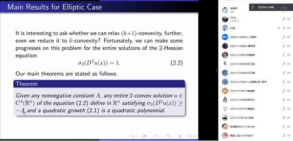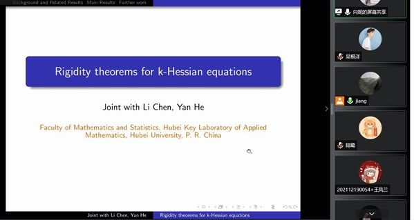 2022年3月11日下午3点,由统计与数学学院主办的“Rigidity theorems for k-Hessian equations”学术讲座采用线上腾讯会议的方式成功举办。本次讲座由湖北大学数学与统计学学院教授向妮主讲,学院部分研究生参加了此次讲座。