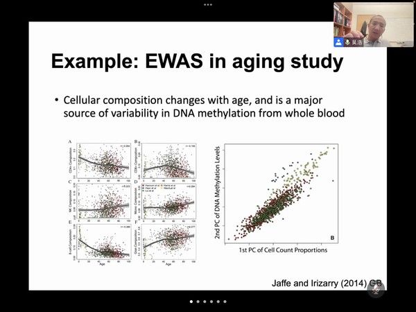 接下来,吴浩教授介绍了来自异质样本的“批量”高吞吐量数据是来自多个细胞类型信号的加权平均。吴浩教授以老年研究中的EWAS为例,表明了细胞组成随着年龄的变化而变化,这是全血DNA甲基化变化的主要来源。
