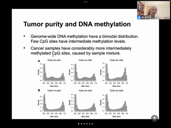 吴教授借助β值讲解了肿瘤纯度和DNA甲基化,并指出全基因组DNA甲基化呈双峰分布,少数CpG位点具有中等甲基化水平。癌症样本有相当多中间甲基化CpG位点造成的样品混合物。