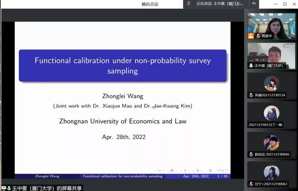 2022年4月28日下午14:00,由统计与数学学院主办的中南财经政法大学“Functional calibration under non-probability survey sampling”学术讲座以线上讲座的形式在腾讯会议成功举办。本次讲座由厦门大学王中雷教授主讲,韩爱华老师主持,学院部分老师和研究生参加了此次讲座。