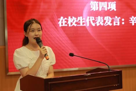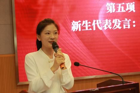 2021级经济统计专业辛悦同学作为在校生代表发言,她结合自身经历,鼓励新同学们沉下心钻研学术,学习专业本领,勇于挑战自我,脚踏实地、坚持创新,强身健体、减少内耗,创造出自己丰富多彩的青春篇章。