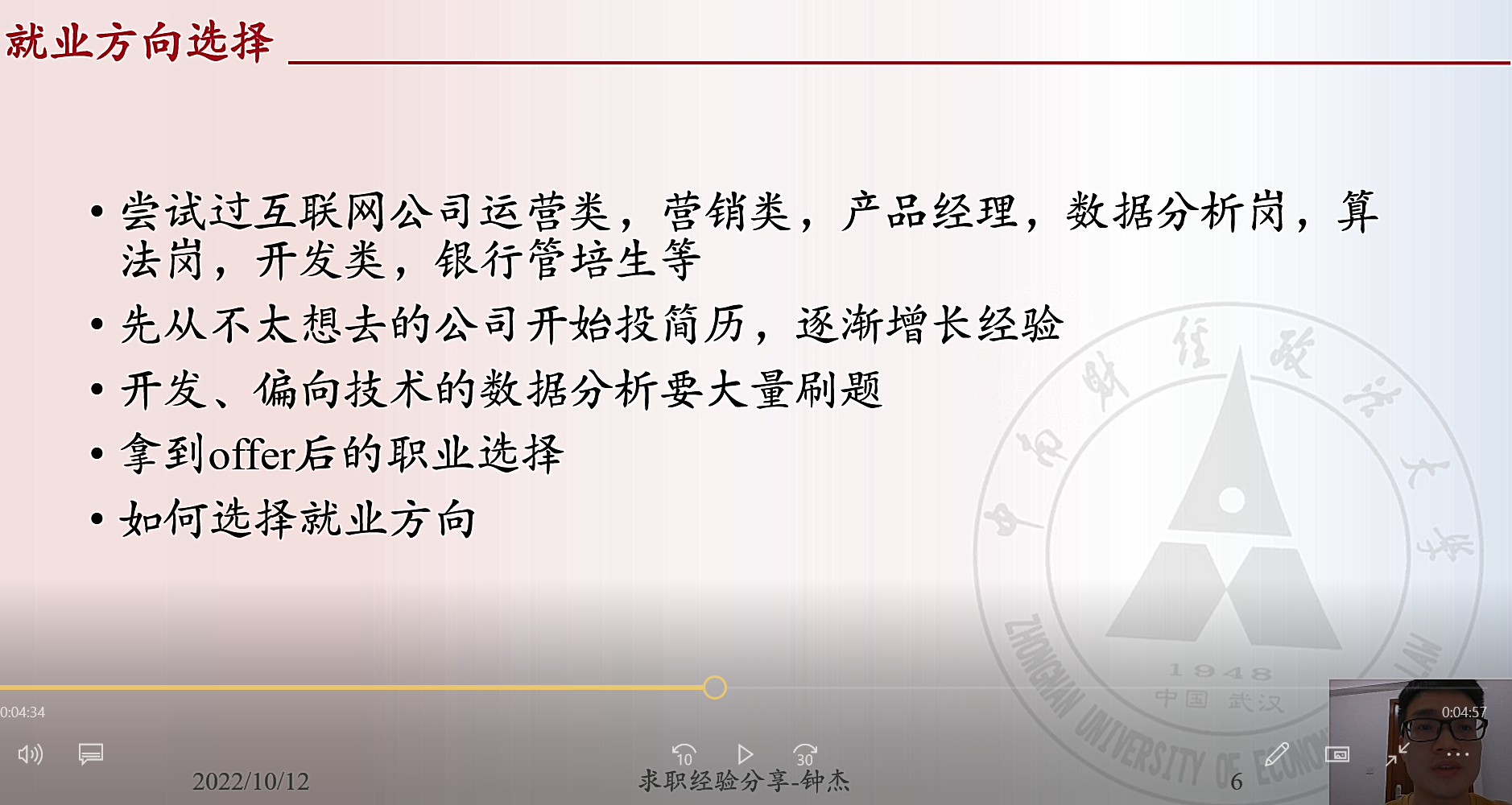 会议第四项,钟杰线上做就业经验分享。钟杰分享了他从考研到求职的转折之路。谈及去年的求职经历,他就方向选择、笔试资料、面试经验等进行介绍,鼓励同学们勇于尝试,找到适合自己的工作。