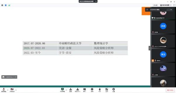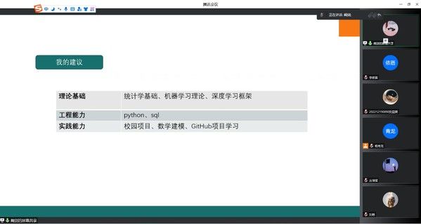 为加强新型应用型统计专业人才培养,帮助学院研究生了解就业形势、提升就业技能、缓解就业压力,实现多方资源有机结合和优化配置,统计与数学学院第五期“大数据行业专家讲堂”于11月6日晚6:30在腾讯会议线上举办。我院2020届数理统计专业毕业生阚剑和2020届应用统计专硕毕业生钱超超结合自身就业情况向同学们分享就业经验。统计与数学学院副院长杨青龙教授主持本次会议。