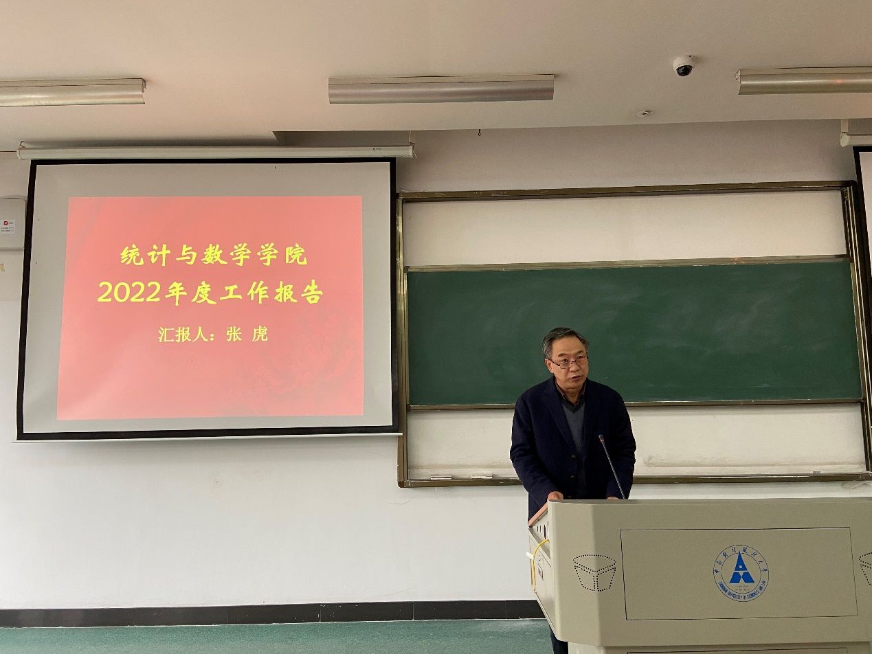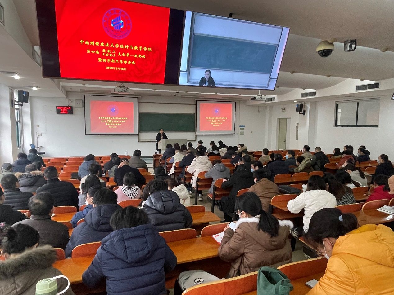 会议第一阶段进行的是学院第四届教职工、工会会员大会第一次会议。院党委书记梁娜传达了学校教代会会议精神,阐释了近期教育部、学校所提示的热点问题,并向全体教职工开展党风廉政宣传教育及教师思想政治和师德师风教育。随后,统计与数学学院院长张虎以2022年度工作报告回顾了学院在人才培养、科学研究和人才工程方面取得的成绩和突破,副院长常金华、党委副书记王瑄分别作学院2022年度财务、工会报告,学院还通过表决了第四届工会委员会委员候选人。