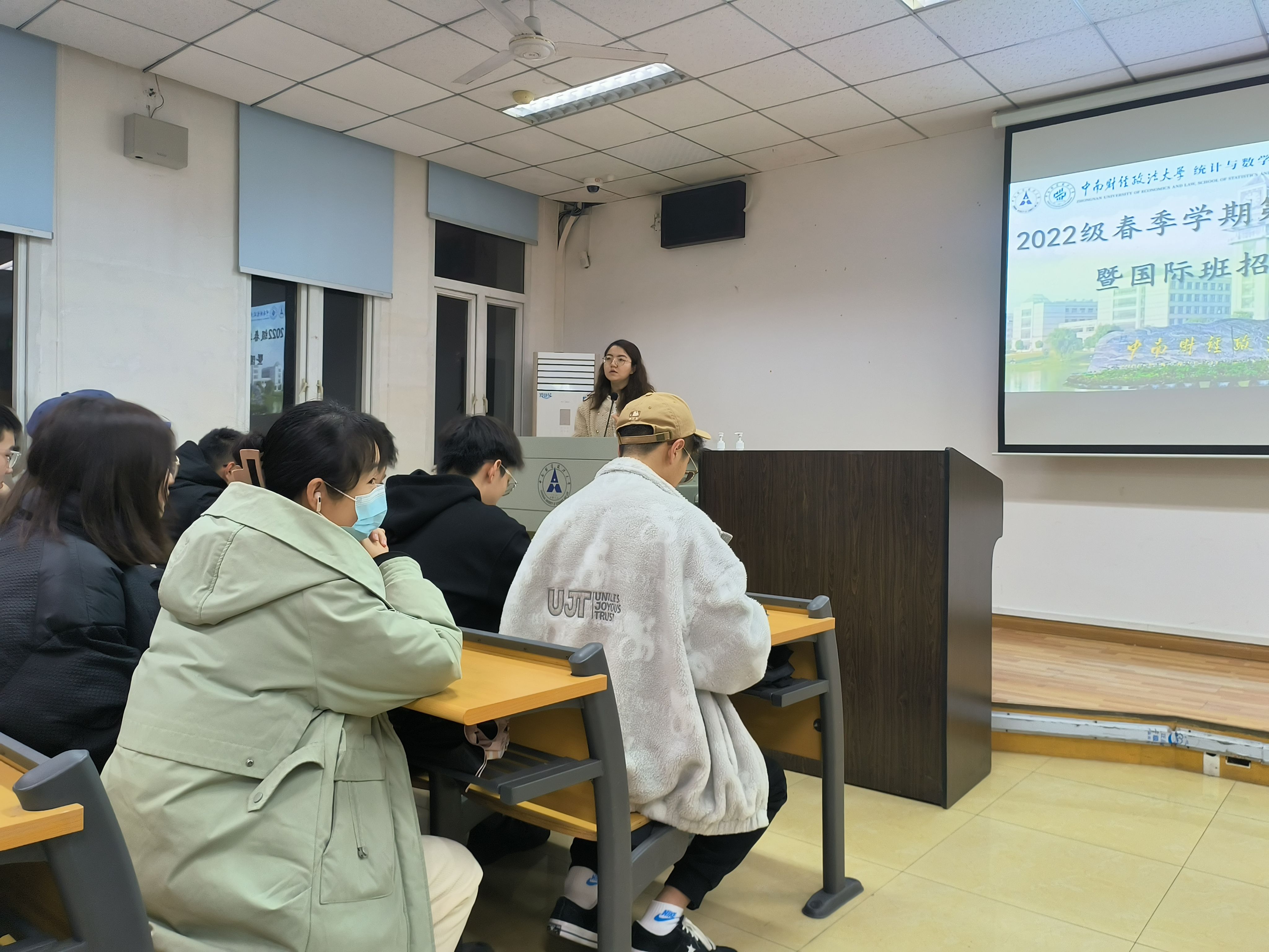 (通讯员 查雨珩)为更好地迎接新学期,调动年级学习氛围,2月18日晚,统计与数学学院全体2022级本科生于文润303召开2022-2023学年第二学期第一次年级大会暨国际班招生宣讲会。会议邀请到统计与数学学院统计学系副教授赵目老师进行国际班招生宣讲,年级大会由统计与数学学院2022级辅导员胡瑶老师和伊帕尔古丽·吐尔孙江老师主持。