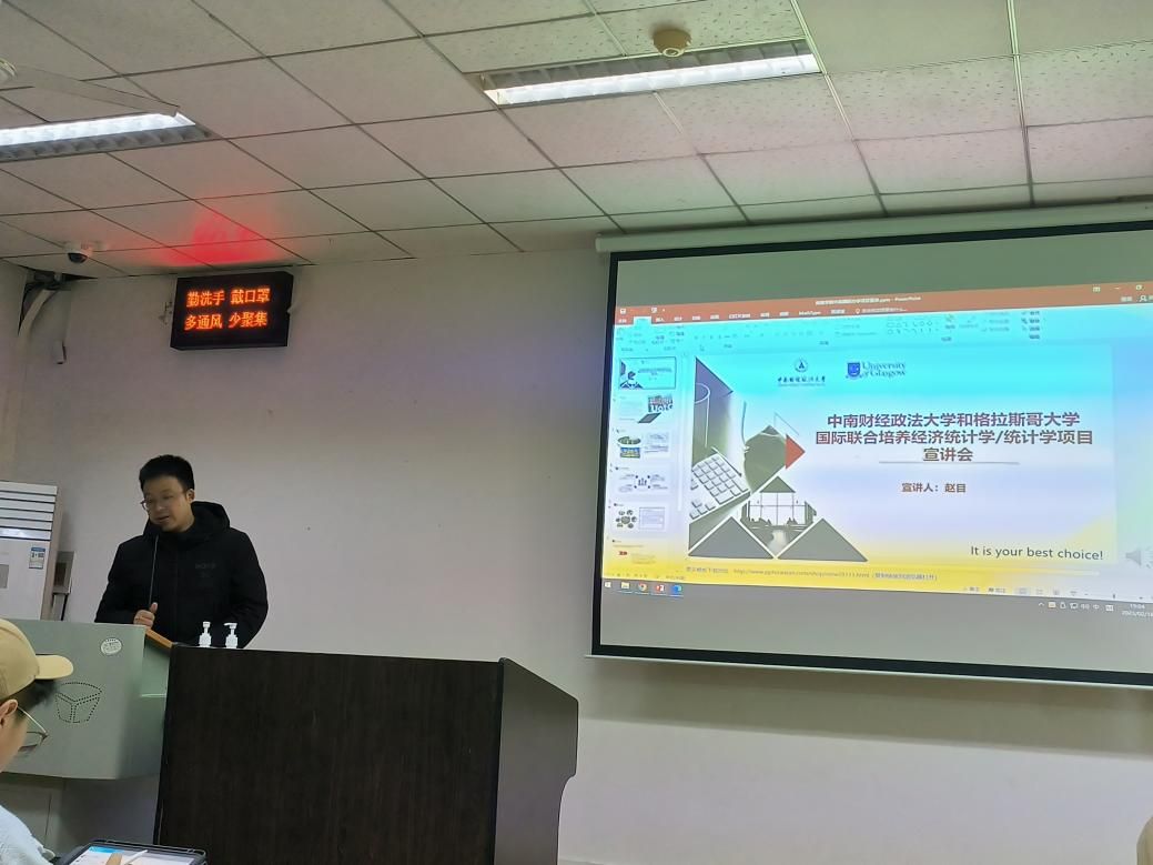 年级大会结束后,统计与数学学院统计系副教授赵目老师主持召开国际班招生宣讲会,详细介绍了本院“2+2”国际联合培养项目实施情况以及国际方英国格拉斯哥大学的相关情况及学术排名。同时结合自身经验,为同学们生动讲述国外经历及见闻,播放往届曾参加此项目的师兄师姐的介绍视频,让同学们对此国际联合培养项目有了更深入的了解。