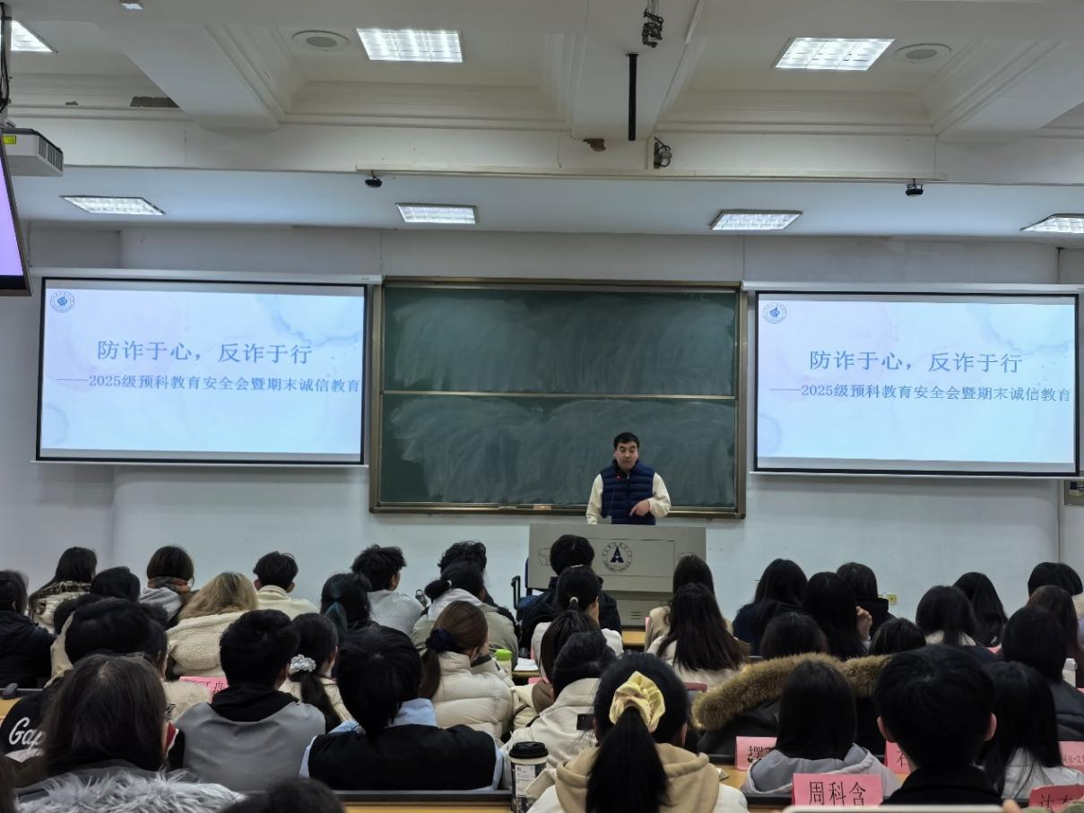 (通讯员:范瑾钰、邓劼锋、马婕、江之胜)为强化学生安全防范意识、筑牢校园反诈防线,同时严肃考风考纪、倡导学术诚信,12 月 25 日,2025 级预科 “防诈于心,反诈于行” 安全教育暨期末诚信教育会在文津楼 301 教室召开。会议由预科辅导员艾合买提・吐尔地主讲,全体预科生参会。