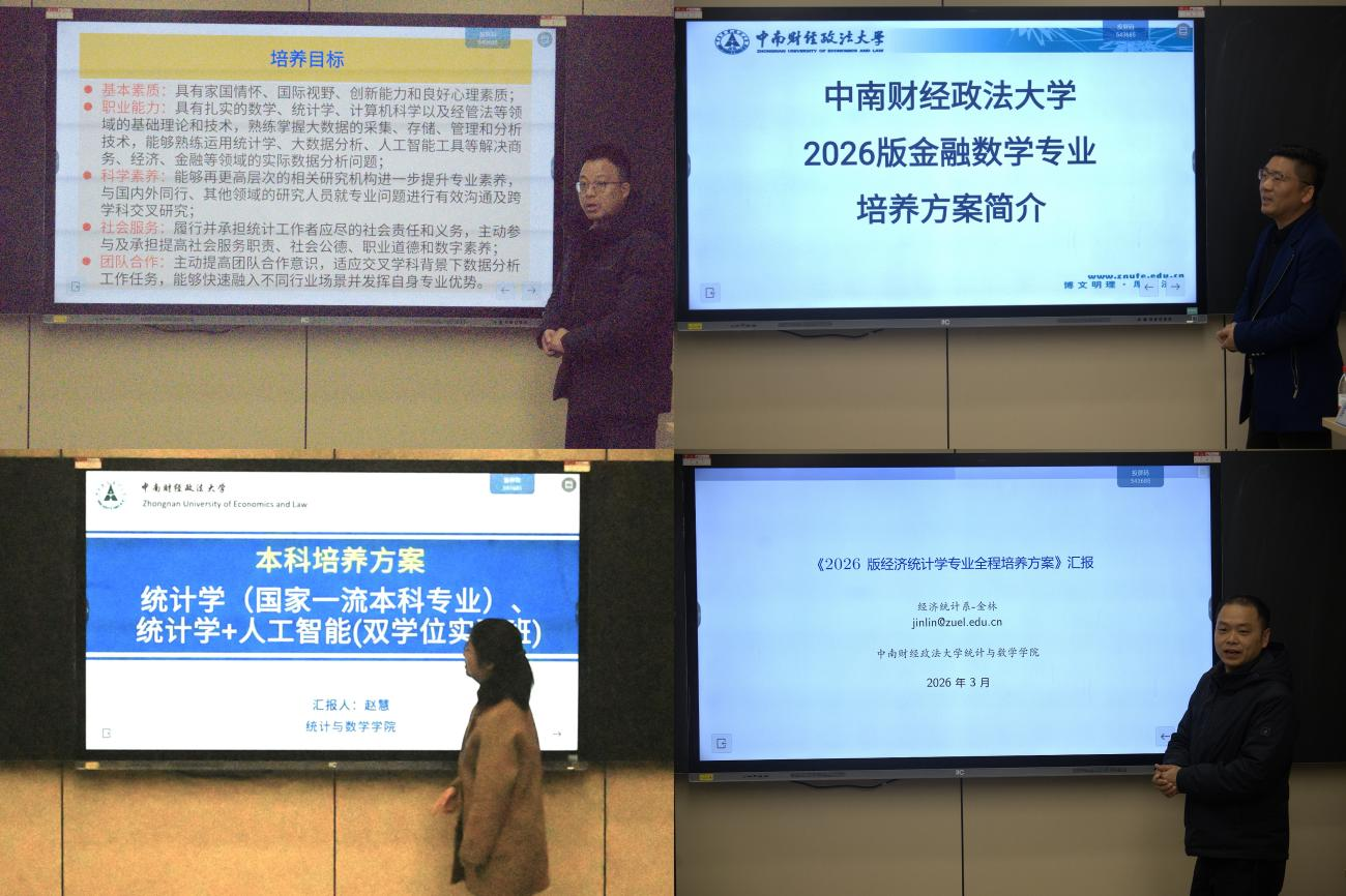 在论证环节,统计学、统计学+人工智能双学位、应用统计学、经济统计学、金融数学等专业的负责人依次汇报了本专业的培养方案。汇报围绕专业培养目标、课程体系构建、专业特色凝练等方面展开,重点阐释了方案如何贯彻学校“中国化、融通化、数字化、国际化”的“四化同步”发展方针,并通过构建“通识教育+专业教育+实践培养”的三位一体课程体系,着力强化学生的数理基础与跨学科素养。