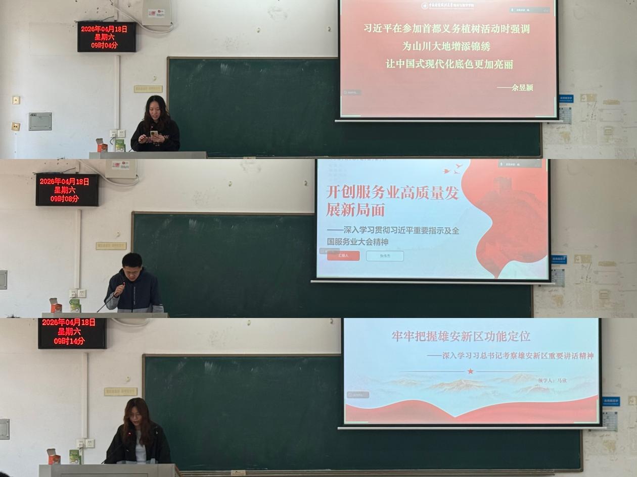 理论学习环节,佘昱颖、张伟杰、马欣三位党员同志紧扣学习主题,依次围绕习近平总书记重要讲话重要指示精神开展领学解读。佘昱颖同志领学习近平总书记在参加首都义务植树活动时的重要讲话,深刻阐释生态文明建设的重要意义,强调要为山川大地增添锦绣、让中国式现代化底色更加亮丽;张伟杰同志领学习近平总书记关于服务业发展的重要指示,聚焦需求牵引、改革攻坚、科技赋能、开放合作,解读服务业高质量发展的实践路径;马欣同志领学习近平总书记在河北雄安新区考察时的重要讲话精神,引导全体党员牢牢把握雄安新区功能定位,服务国家重大战略部署。三位同志的领学内容兼具理论深度与实践指导性,有效推动党的创新理论入脑入心。