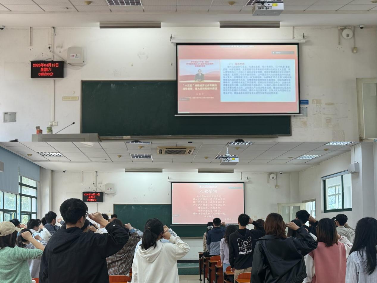活动伊始,全体党员集体观看《“十五五”时期经济社会发展的指导思想、重大原则和根本保证》专题学习视频。通过系统学习“十五五”时期经济社会发展的总体部署与核心要求,全体党员进一步坚定理想信念,增强党性意识与政治自觉,切实把思想和行动统一到党中央决策部署上来。随后,在2025级硕士研究生第一党支部书记郑伟健同志的带领下,全体党员重温入党誓词。