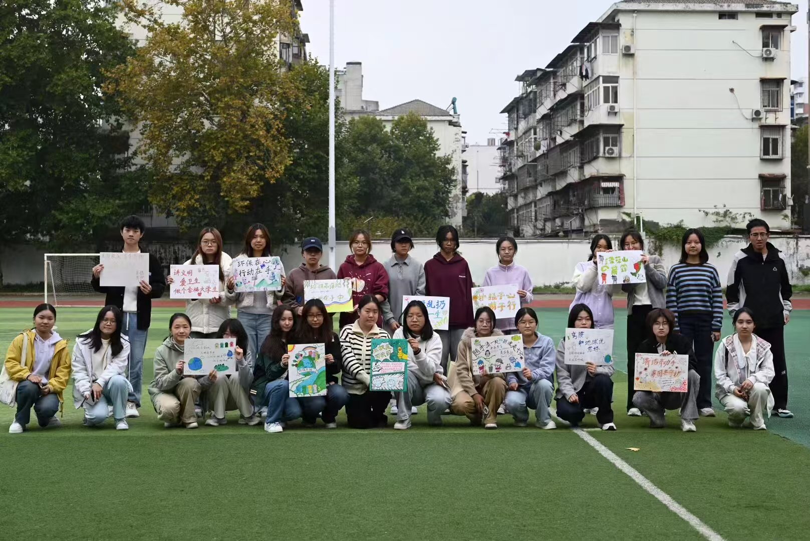 绘制完成后,负责人在南操场的合适位置将同学们精心制作的环保标语悬挂展示,时刻提醒过往师生关注环境保护,共同守护美丽校园。