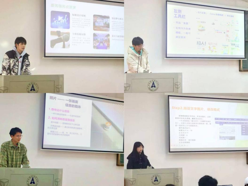 授课环节,金融学院分团委各部门负责人聚焦核心技能展开针对性培训。新闻部部长姬鸿飞围绕“打造出色校园新闻报道”,梳理新闻构成要素、写作要点与常见误区,强调新闻图片需主题鲜明、富有感染力;宣传设计部部长常晋宇通过Canva工具实操演示海报设计,讲解优质资源推荐与设计思路构建;摄影部部长曾子秋针对会议、运动、合影等典型场景,解析构图技巧与拍摄要点;媒体运营部副部长宁志云详细演示剪映工具使用方法与推文制作全流程。
