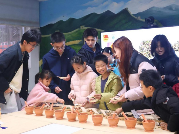 在香囊制作环节,团员们与小朋友们结成一对一小组,围坐在桌前进行香料选取与研磨。在此过程中小朋友们不时提出有关香料搭配和研磨手法等问题,团员们一一耐心解答,手把手教学。团员们在制作中学习香料配比的传统技巧,传递文化知识;小朋友们则在亲手研磨中感受手工制作香囊的乐趣,收获与团员们相处的温暖。
