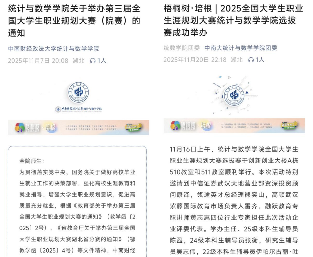 作为本次大赛成长赛道的承办单位,中南财经政法大学统计与数学学院精心筹备、全力保障赛事顺利开展。同时我院学子凭借扎实的专业素养与清晰的职业规划脱颖而出,斩获多项大奖:傅耀茗荣获就业赛道研究生组一等奖、涂睿辰荣获就业赛道本科生组一等奖、丁小川荣获成长赛道二等奖,实现“两条赛道、三项大奖”的全覆盖,充分展现了统数学子的职业潜力与学院育人成果。