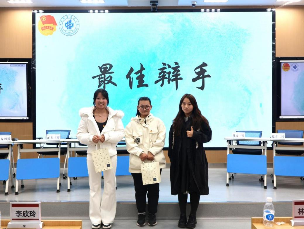 比赛期间,评委团从辩题定义、逻辑架构、价值升华等维度进行专业点评,既肯定辩手们的精彩表现,也提出针对性建议。活动采用“评委投票+学员投票”的加权投票制,最终评选出“创赢时代队”和“我说的都队”两支优胜队伍,由团学志骨干杨奕睿和吴瑷安进行颁奖。汪绮梦、陈诺馨两位同学获评“最佳辩手”,由辩论队队长郭亚晴颁奖。