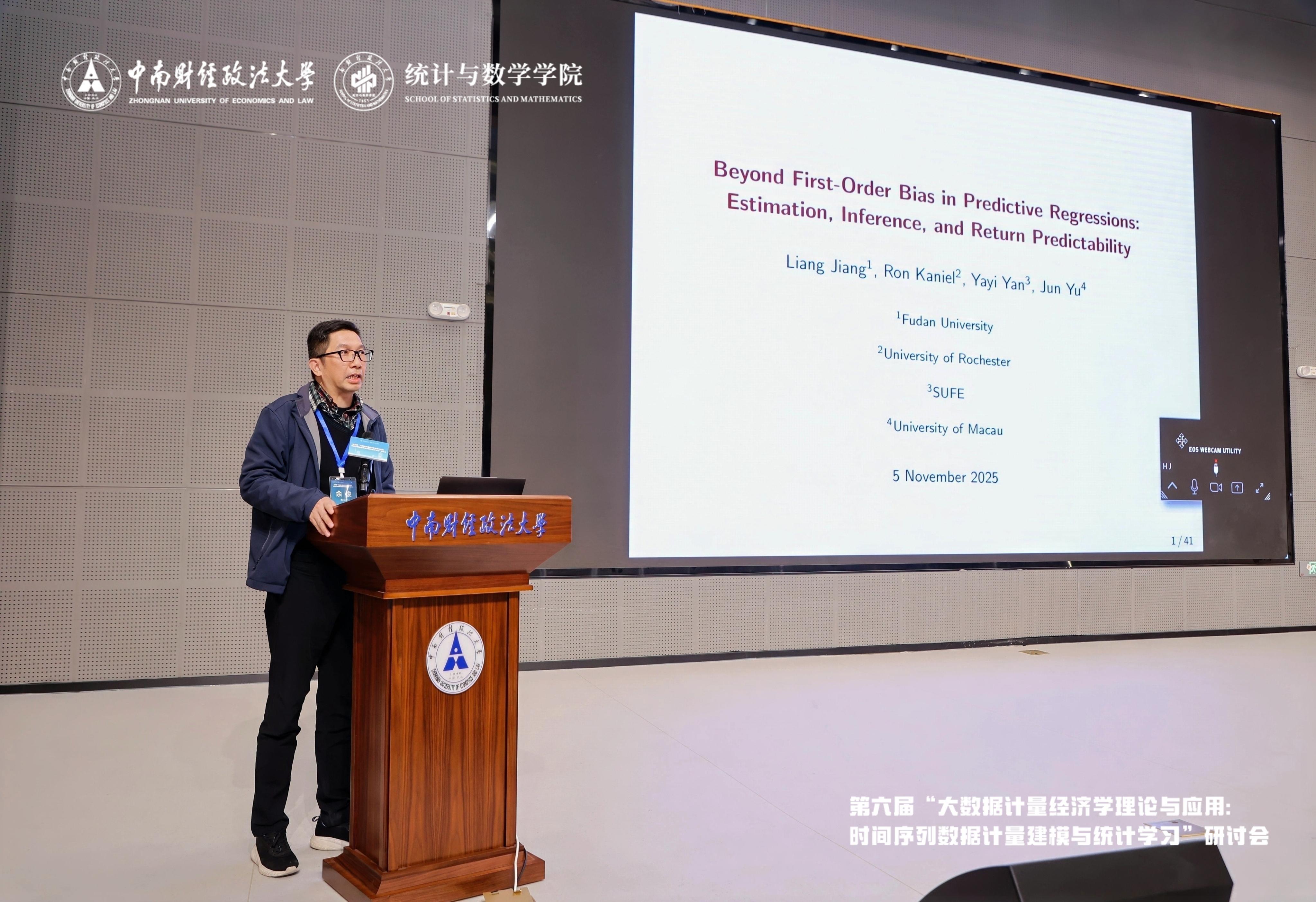 澳门大学工商管理学院院长余俊教授以“Beyond First-Order Bias in Predictive Regressions:Estimation, Inference, and Return Predictability”为主题,阐述了iBoot统一框架的创新价值——该框架首次将间接推断与自助法有机结合,彻底校正了预测回归中长期被忽视的高阶偏差,即便在小样本、持续变量及长窗口场景下,仍能实现精准推断。