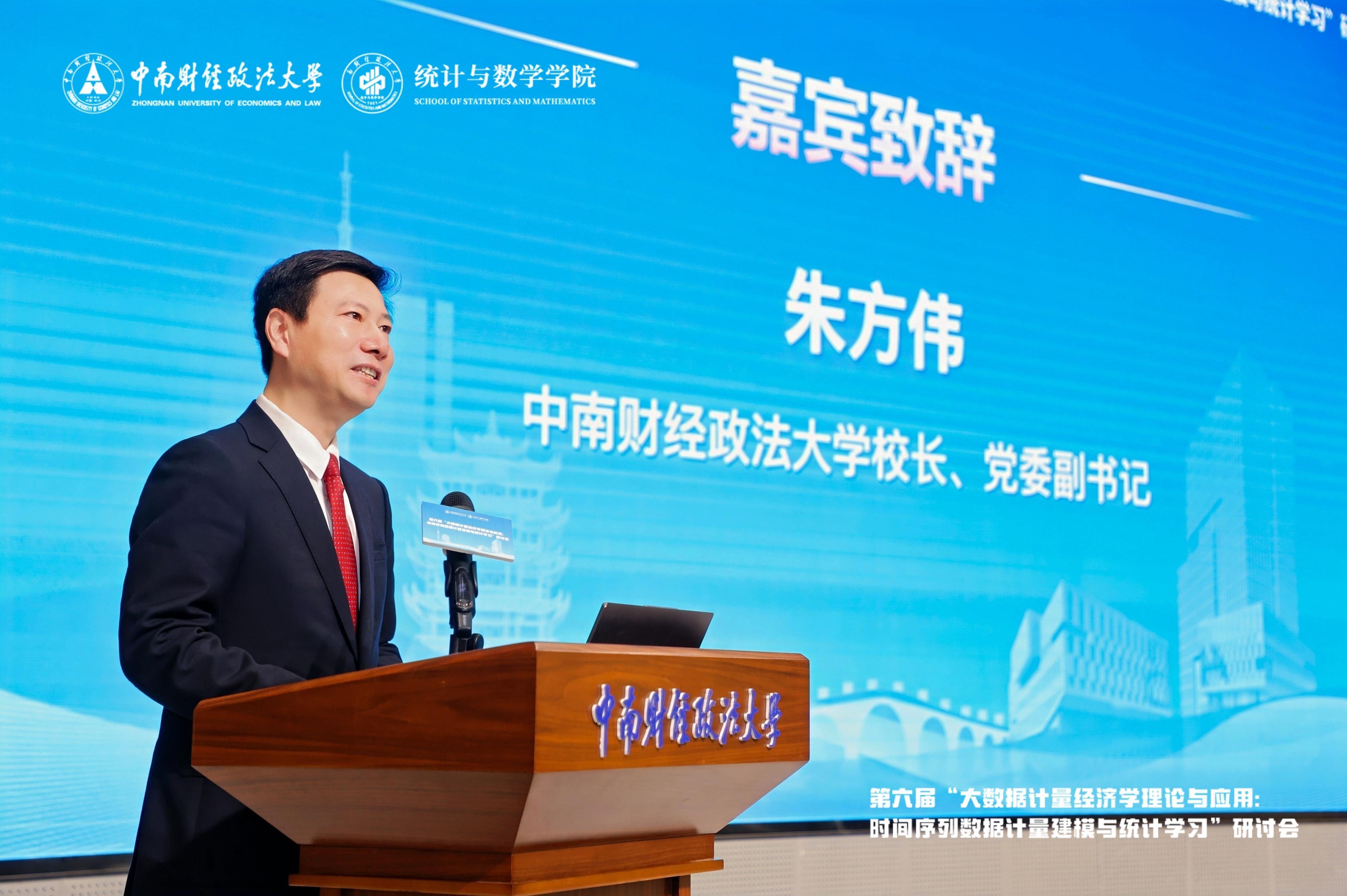 中南财经政法大学校长、党委副书记朱方伟在致辞中介绍了历史沿革、办学特色、人才培养现状。他强调,学校始终高度重视应用经济学等学科建设,持续深化教师职业发展、科研支持等领域的制度改革,以更具活力的保障体系广纳贤才,热切期盼各界英才加盟,携手推动学科突破与学校高质量发展。