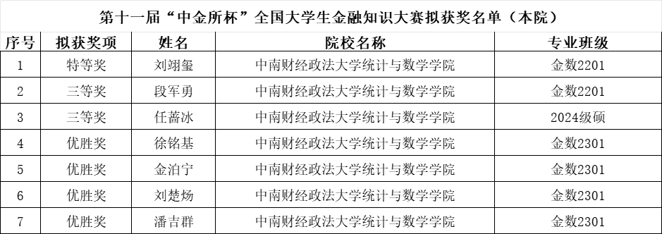 (通讯员:刘童舒)近日,由中国金融期货交易所、中国期货业协会联合主办,东方财富提供技术与媒体支持的第十一届“中金所杯”全国大学生金融知识大赛拟获奖名单正式公示。我院学子凭借扎实的专业功底与卓越的实践能力在全国69814名参赛选手中脱颖而出,斩获多项荣誉。其中来自金数2201班的刘翊玺同学凭借其对金融衍生品定价模型的精准把握与创新应用,成功斩获全国特等奖,成为全国仅有的10名获此殊荣者之一;金数2201班段军勇与2024级硕士任蔷冰荣获三等奖;金数2301班徐铭基、金泊宁、刘楚炀、潘吉群四位同学获得优胜奖。