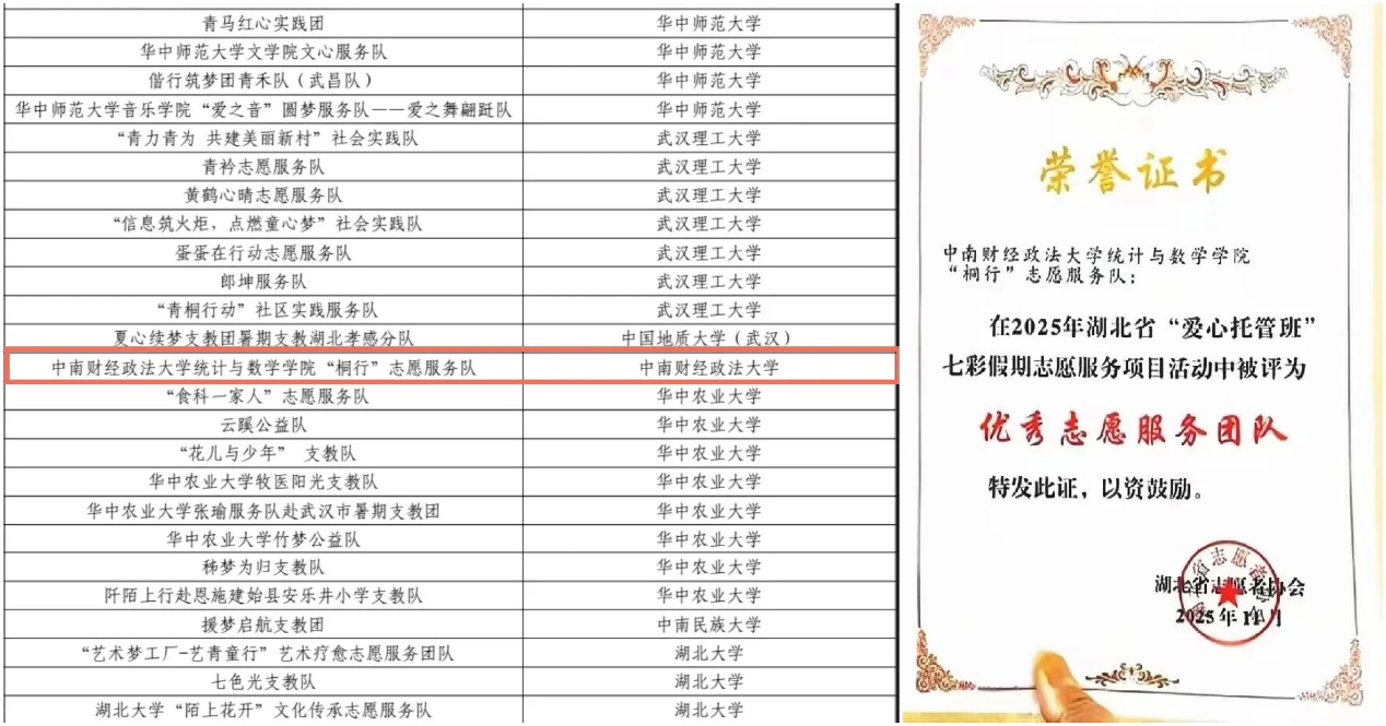 (通讯员:黄欣玥)近期,中南财经政法大学统计与数学学院“桐行”志愿服务队获评湖北省“爱心托管班”七彩假期志愿服务项目优秀志愿服务团队。这份荣誉,既是对学院长期以来支持志愿服务、深耕实践育人工作的认可,也是对“桐行”团队扎根基层、奉献担当的充分肯定。
