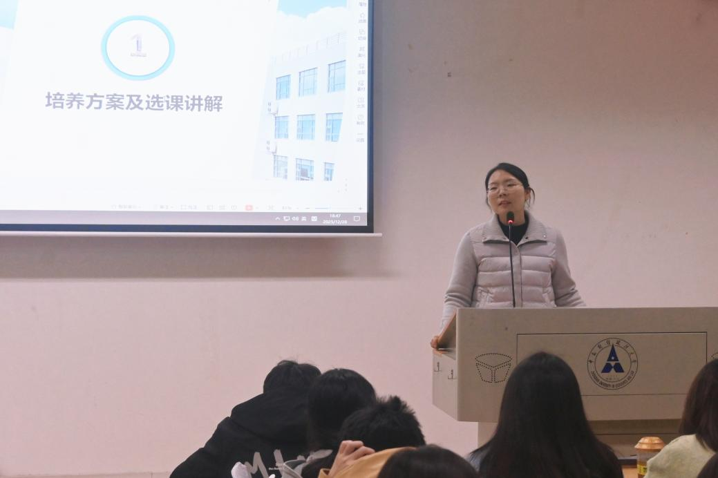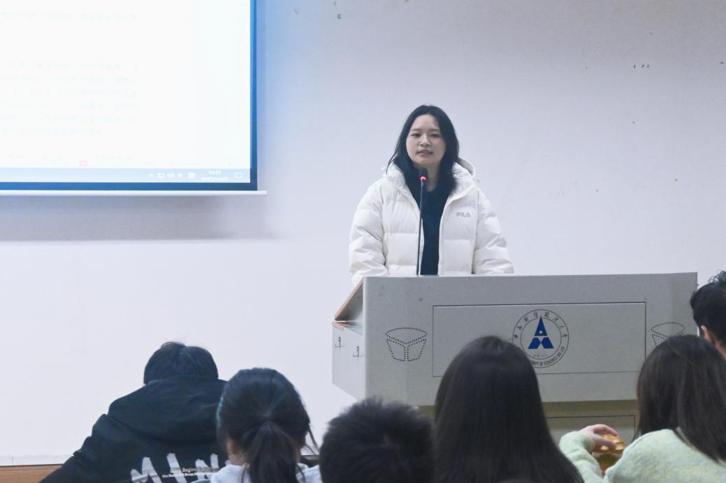 在学业规划环节,2023级本科生代表尧雨馨为同学们解读专业培养方案。她以数财专业为例,详细介绍了四大课程模块的学分构成与修读要求,梳理了必修课、通识课及选修课之间的逻辑关系与选课时序,并重点强调“课程适配性”原则,帮助同学们规避选课误区,合理规划个性化学习路径。