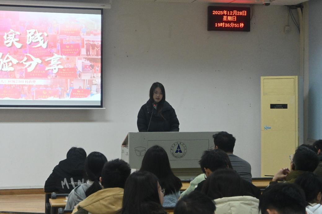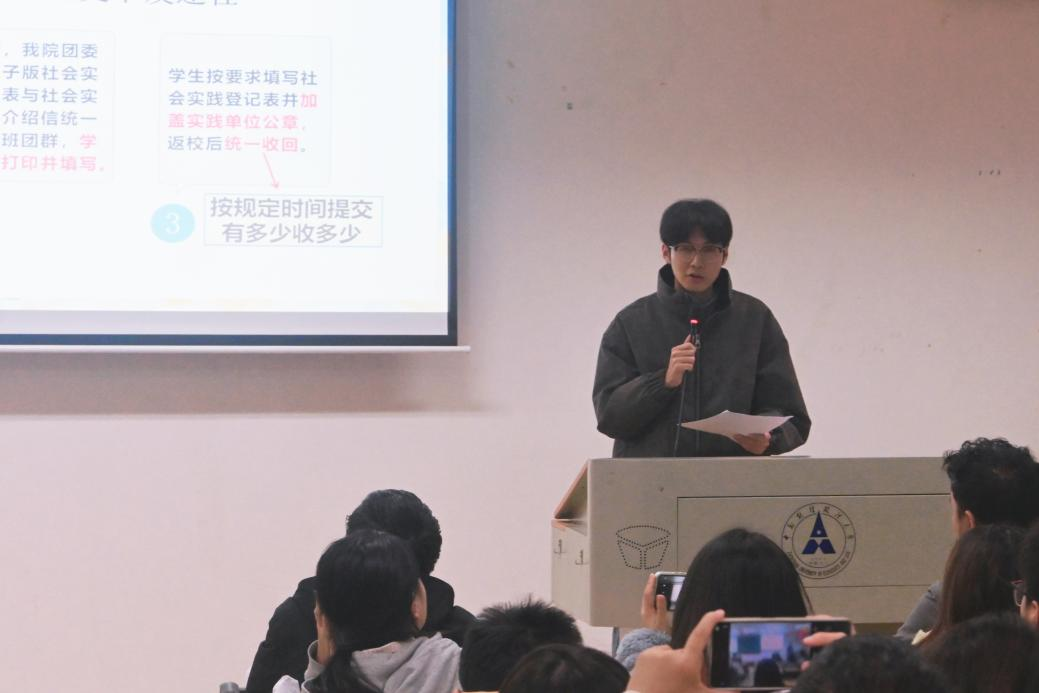 学院组织实践部负责人2024级本科生陈佳辉介绍了寒假社会实践相关安排。他明确毕业前须完成6次社会实践的要求,并对实践申报、过程记录与成果提交等环节作了具体说明,鼓励同学们以多样形式展示实践成果,在实践中提升综合素质。