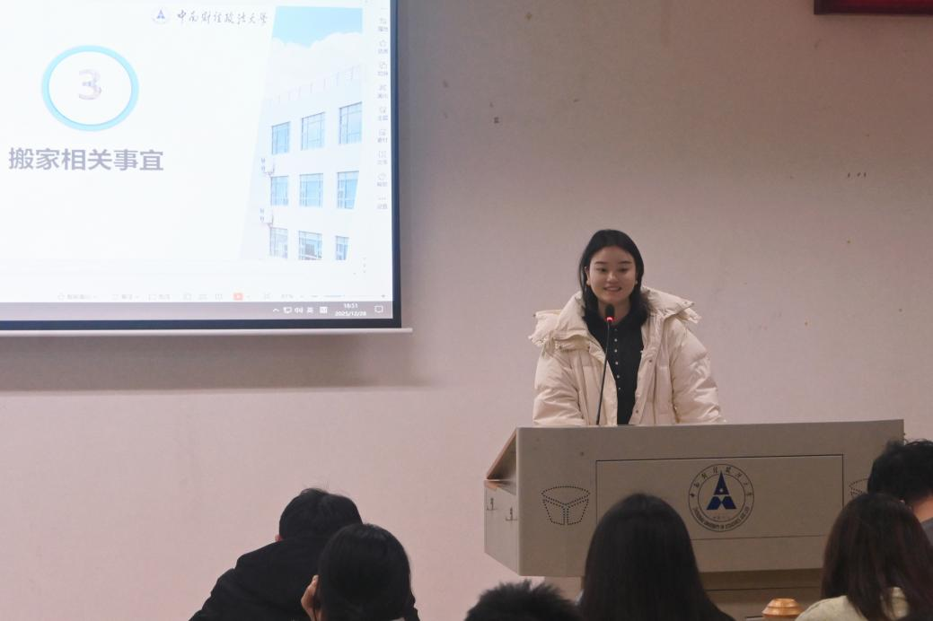 对于寒假搬迁事宜,周潇就时间安排、安全保障与操作流程进行了详细说明。她提醒同学们在行李打包时应遵循“轻重搭配、密封牢固、信息清晰”的原则,严禁携带违禁物品,贵重物品须自行保管。离校前,学生需完成宿舍清整、钥匙归还及断电关窗等工作。