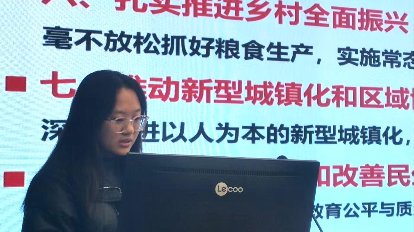 贾紫涵同学介绍了全国两会的情况和重要意义,围绕两会核心议题、重要精神与民生关切要点、政府工作报告进行了细致解读,并与参会学生就科技自立自强、打造智能经济新形态、深化市场化改革等与专业息息相关的内容展开交流分享。