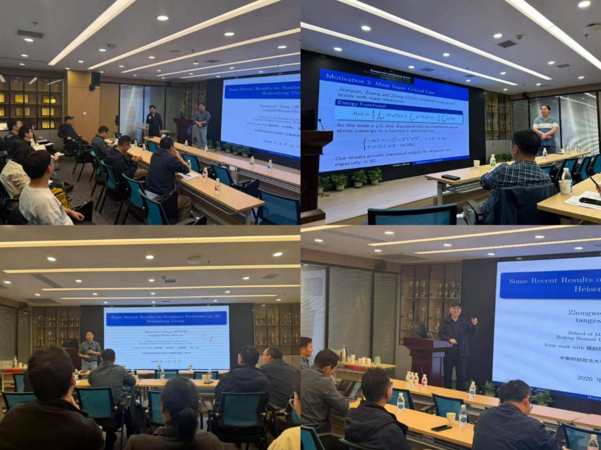 报告环节,北京师范大学唐仲伟教授以“Some Recent Results on Nonlinear Problems on the Heisenberg Group”为主题,围绕海森堡群上的非线性方程,深入探讨了海森堡群上相关不等式的公开问题。重庆交通大学张建军教授作题为“Uniqueness of Radial Solutions for m-Laplacian Equations in Low Dimensions”的报告,针对m-Laplacian方程径向解的唯一性开展讨论,其研究成果填补了相关理论空白。华东理工大学姬超教授带来题为“Some results on nonlinear PDEs on lattice graphs”的报告,聚焦晶格图上的非线性偏微分方程,报告了对数薛定谔方程解的存在性和多重性等研究成果,介绍了一些公开问题的研究进展。本次研讨会还邀请到武汉理工大学王征平教授、曾小雨教授、张贻民教授等多位校内外专家学者参会。与会专家围绕变分法与非线性椭圆方程的前沿研究进行了深入交流。