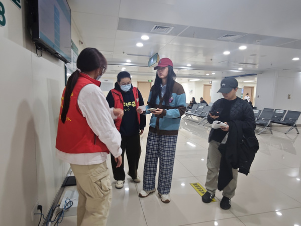 活动当天,志愿者们身着统一志愿者马甲,在医院门诊大厅重点区域分工协作:协助患者在自助机上完成挂号、缴费、单据打印的操作,为视力不佳的群众解读就诊指引单,陪同行动不便的患者前往诊室,同时主动维持候诊区秩序,用耐心细致的服务缓解患者就医焦虑。