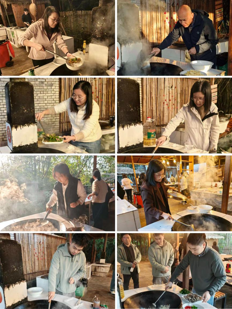随后的“厨艺共飨”环节,老师们分工协作,洗切炒煮间,香辣虾、手抓饭、爆炒花甲、炖猪蹄等佳肴陆续出锅,香气弥漫庄园。未参赛教师化身“大众评委”,手持贴纸为心仪菜品投票,现场烹饪声与欢笑声交织,洋溢着轻松温馨的氛围。