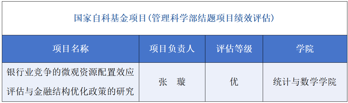 2025年,我院张璇教授主持的国家自科基金面上项目“银行业竞争的微观资源配置效应评估与金融结构优化政策的研究”(项目编号:71873145)在国家自然科学基金委员会管理科学部项目结项鉴定中获评“优秀”等级。