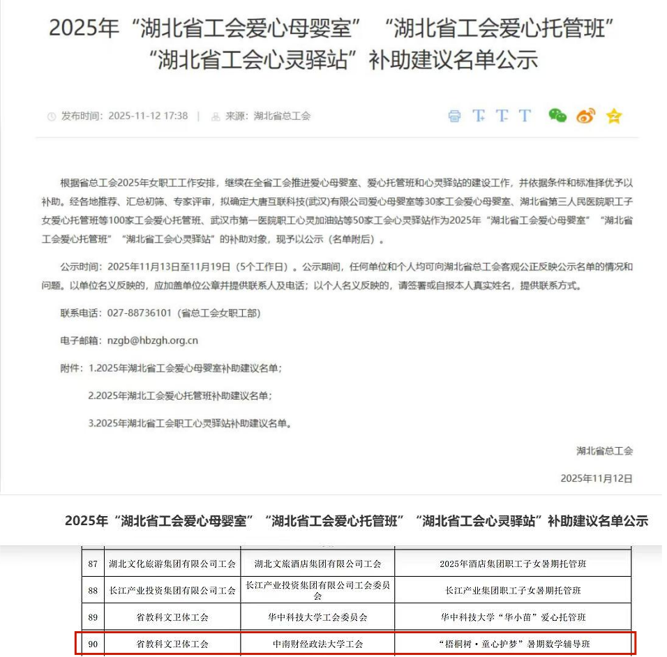 (通讯员:陈玥颐)近日,湖北省总工会公示2025年“湖北省工会爱心母婴室”“湖北省工会爱心托管班”“湖北省工会心灵驿站”补助建议名单,统计与数学学院联合校工会、妇委会开展的“梧桐树·童心护梦”暑期数学公益辅导班项目成功入选。这一荣誉既是对项目三年服务成效的权威肯定,也为其深化发展注入强劲动力。