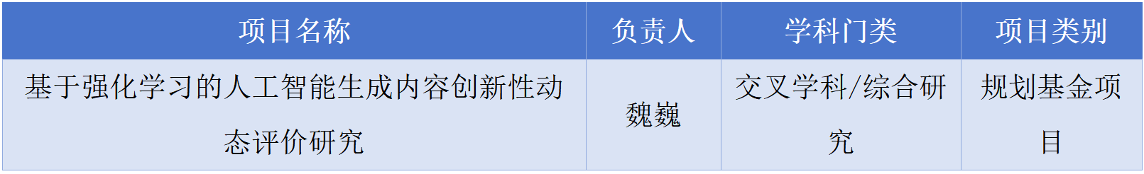 (通讯员 吴志伟李芮萌)11月29日,教育部社会科学司公布了2025年度教育部人文社会科学研究一般项目评审结果。魏巍副教授申报的课题《基于强化学习的人工智能生成内容创新性动态评价研究》成功获得规划基金项目立项。