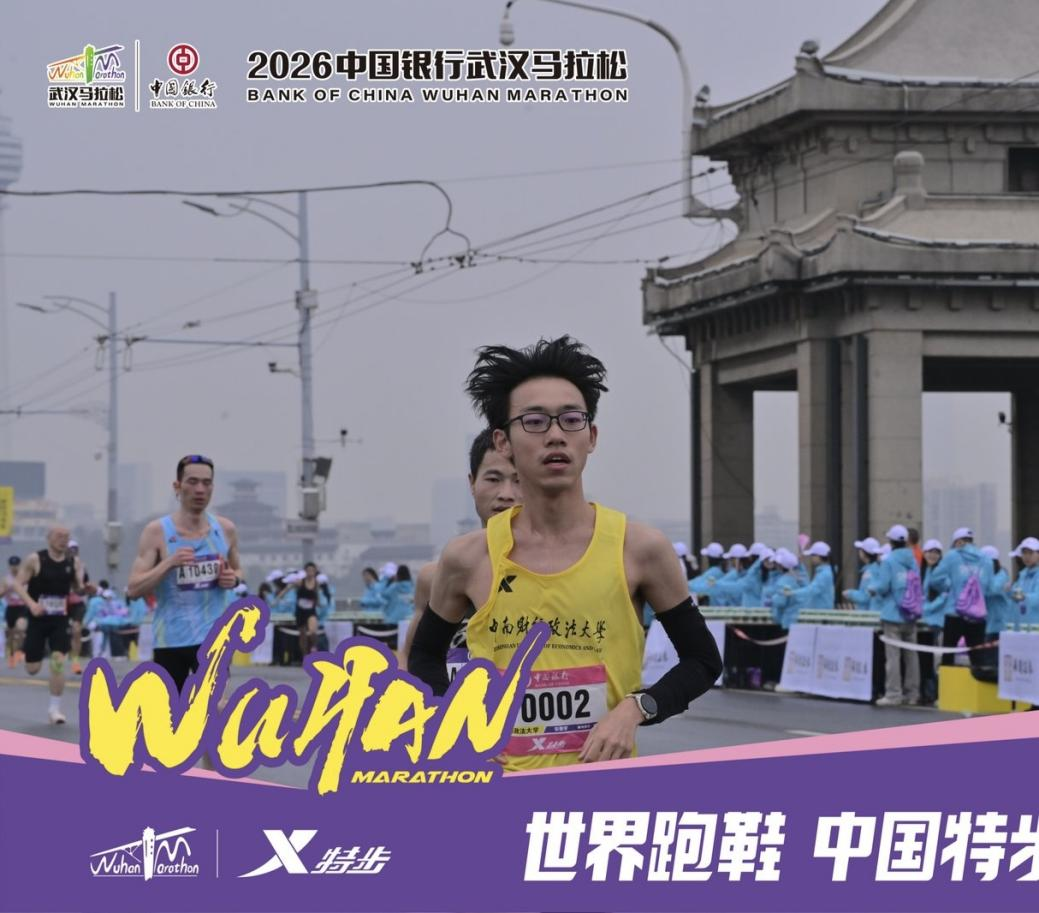 (通讯员 周潇)3月22日,2026武汉马拉松鸣枪开赛,3万名跑者齐聚樱花赛道。中南财经政法大学统计与数学学院2022级本科生朱泰宇作为校代表队男子全马主力,以2小时46分42秒、平均配速3分56秒的成绩完赛,助力校队拿下本届汉马名校挑战赛团体第20名,为学校贡献核心积分。