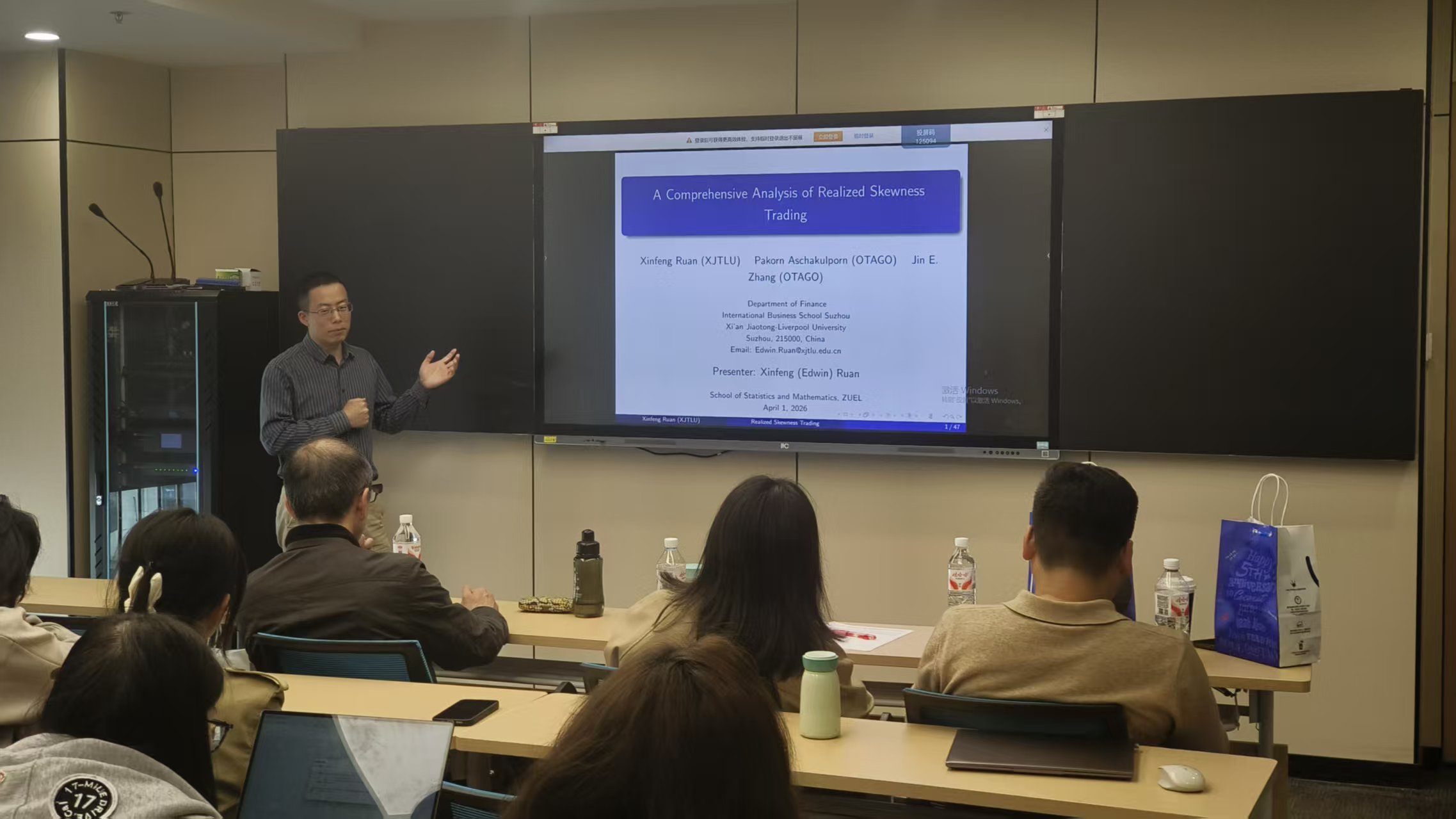 (通讯员 吴志伟 周柳辰)4月1日,由统计与数学学院主办的“中南·统数”计量经济学系列讲座(2026年第4期)在双创楼A栋510教室成功举办。西交利物浦大学副教授阮鑫丰受邀以“A Comprehensive Analysis of Realized Skewness Trading”为题开展前沿学术分享,本期讲座由统计与数学学院李庆副教授主持,学院师生积极参与。